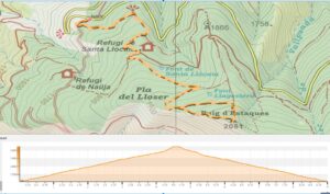 Seguirem la pista fins a la taula d’orientació (1.691 m) Continuarem per la pista fins al creuament després del refugi de Santa Llocaia (1.779 m) on girarem fort a la dreta i continuarem un pujada suau fins el desviament a la dreta una pista ampla però sense deixadar de pujar fins a una curva molt a prop del pla del Lloser (1.926 m) seguim la pista en direcció el tallafoc del puig d’Estaques, aquí haurem de fer llaçades ja que es el troç de més fort pendent de tota l’excursió per culminar el nostre objectiu.