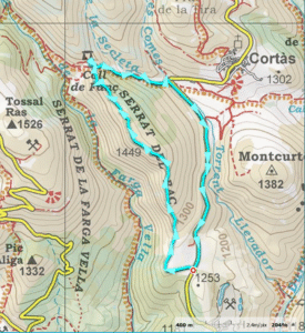 Té uns 4.000 anys d’antiguitat. En resta una part del cromlec que l’encerclava. Es torna al coll i es pren el camí cap a l’esquerra. De seguida baixa en direcció a Cortàs. Prop de la carretera es creua el curs d’aigua, generalment sec menys en època de desglaç. Per la carretera, poc freqüentada, es torna al punt de sortida.