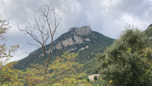 Farem el descens pel collet de Santa Maria i l’amagada església romànica de la Mare de Déu de les Agulles. D’allà, pel coll de la Caseta i el collet de Vinardell baixarem a ca n’Agustí de Riu i la Plana, al nucli disseminat de Riu. A continuació per un camí a l’esquerra anirem a la també església romànica de Sant Feliu de Riu i per sota les coves del Governador i de l’Esparver (un dels tres protagonistes de “La punyalada”), tornarem al pont d’en Valentí, on enllaçarem amb l’itinerari de pujada i seguirem fins a Sadernes.
